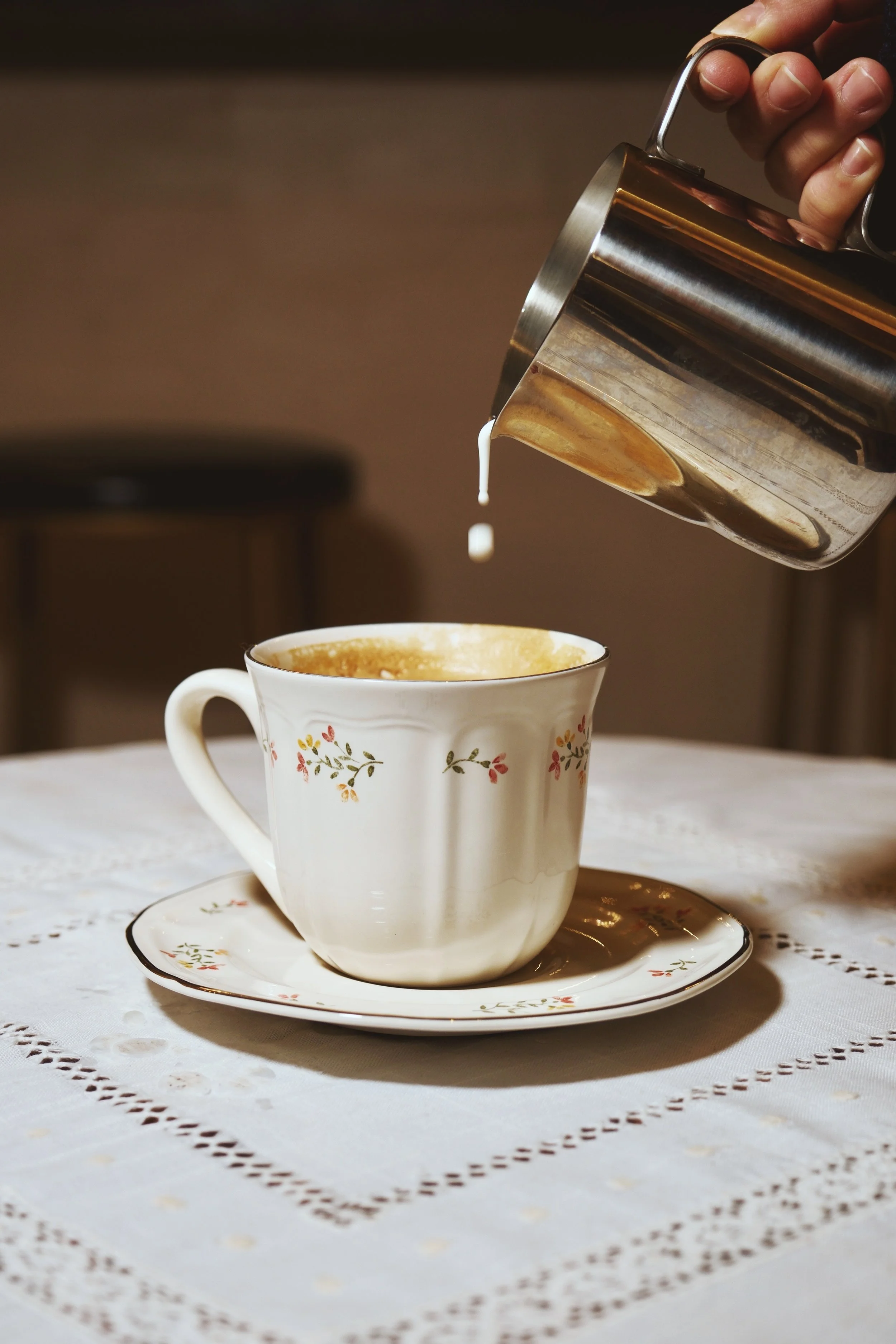 Una mano vierte leche o crema en una taza decorada con flores, colocada sobre un plato a juego, en una mesa con mantelería blanca con bordado