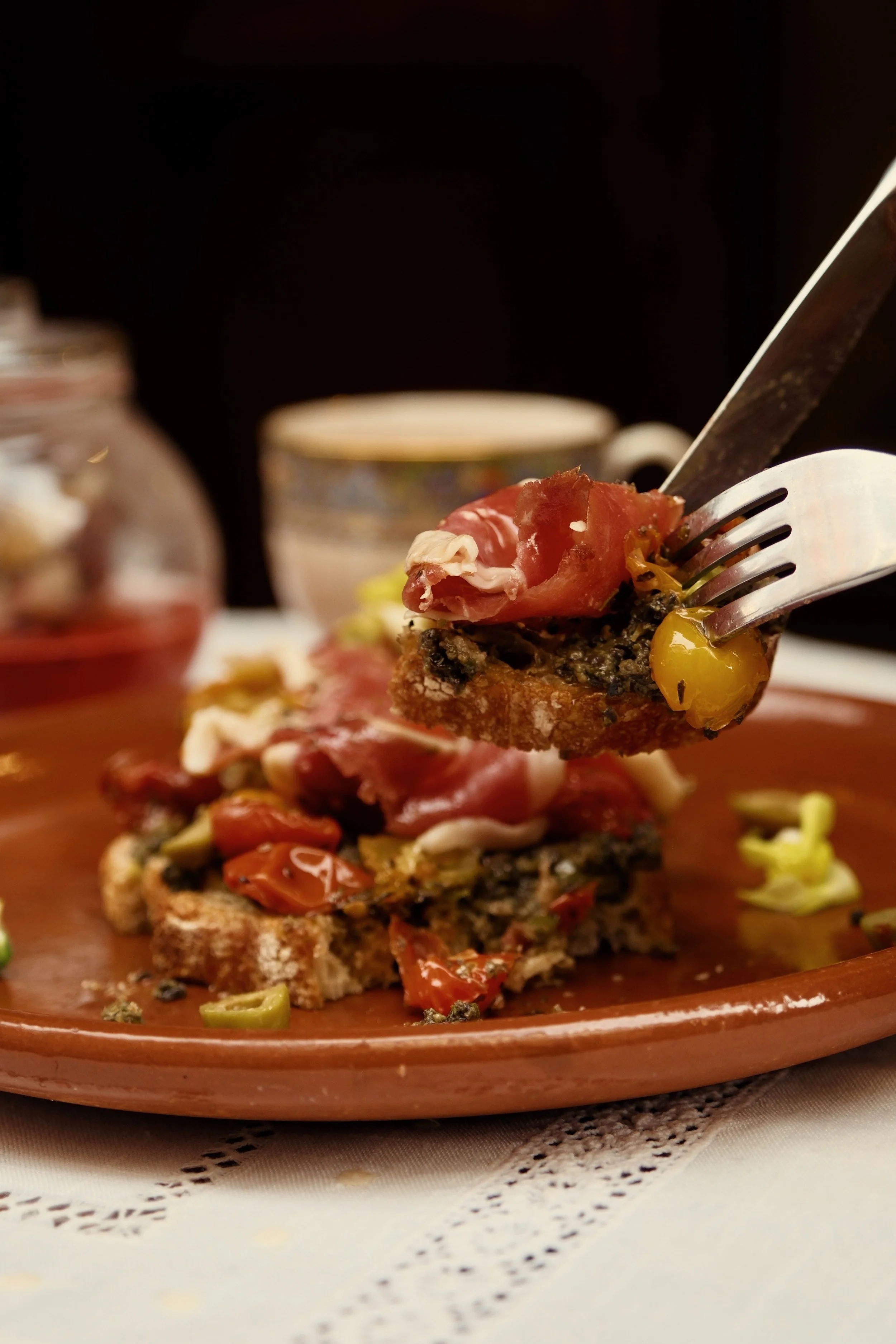 Tostada de pan rústico con tomate confitado, jamón ibérico, tapenade, mermelada de higos y germinados.