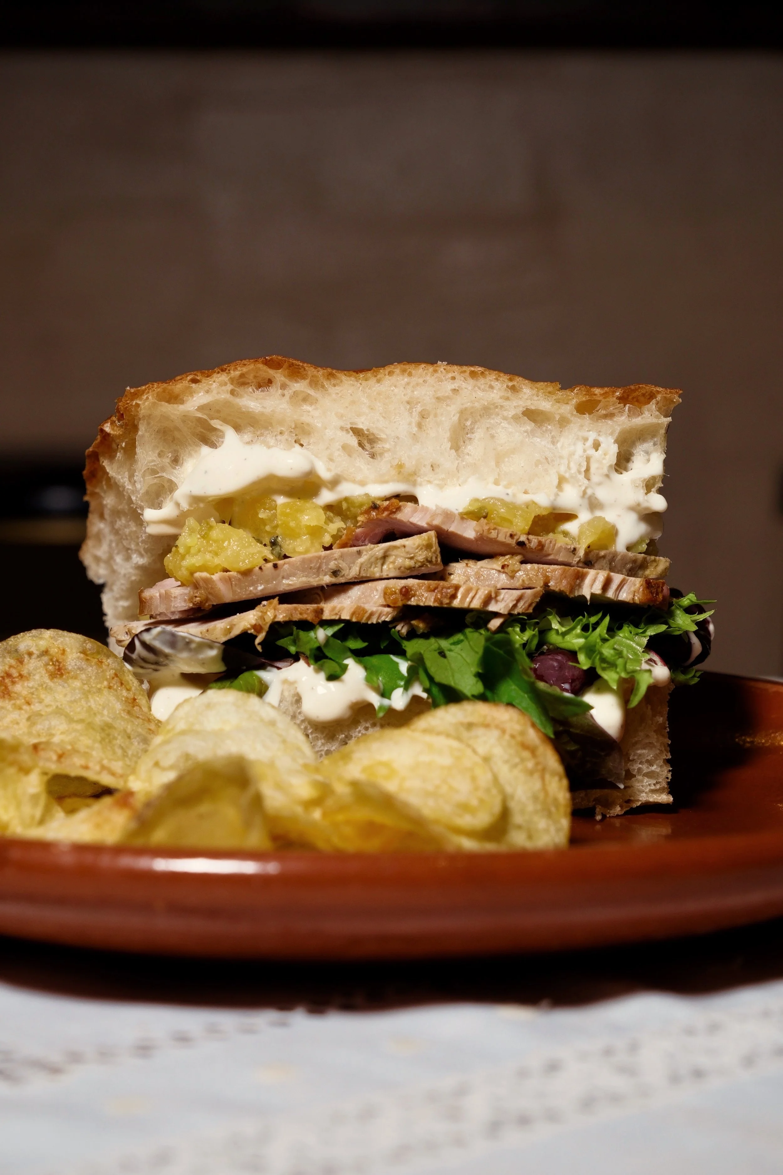 Focaccia de pernil, chutney de piña y mayonesa cítríca servido con papas fritas en un plato de cerámica.