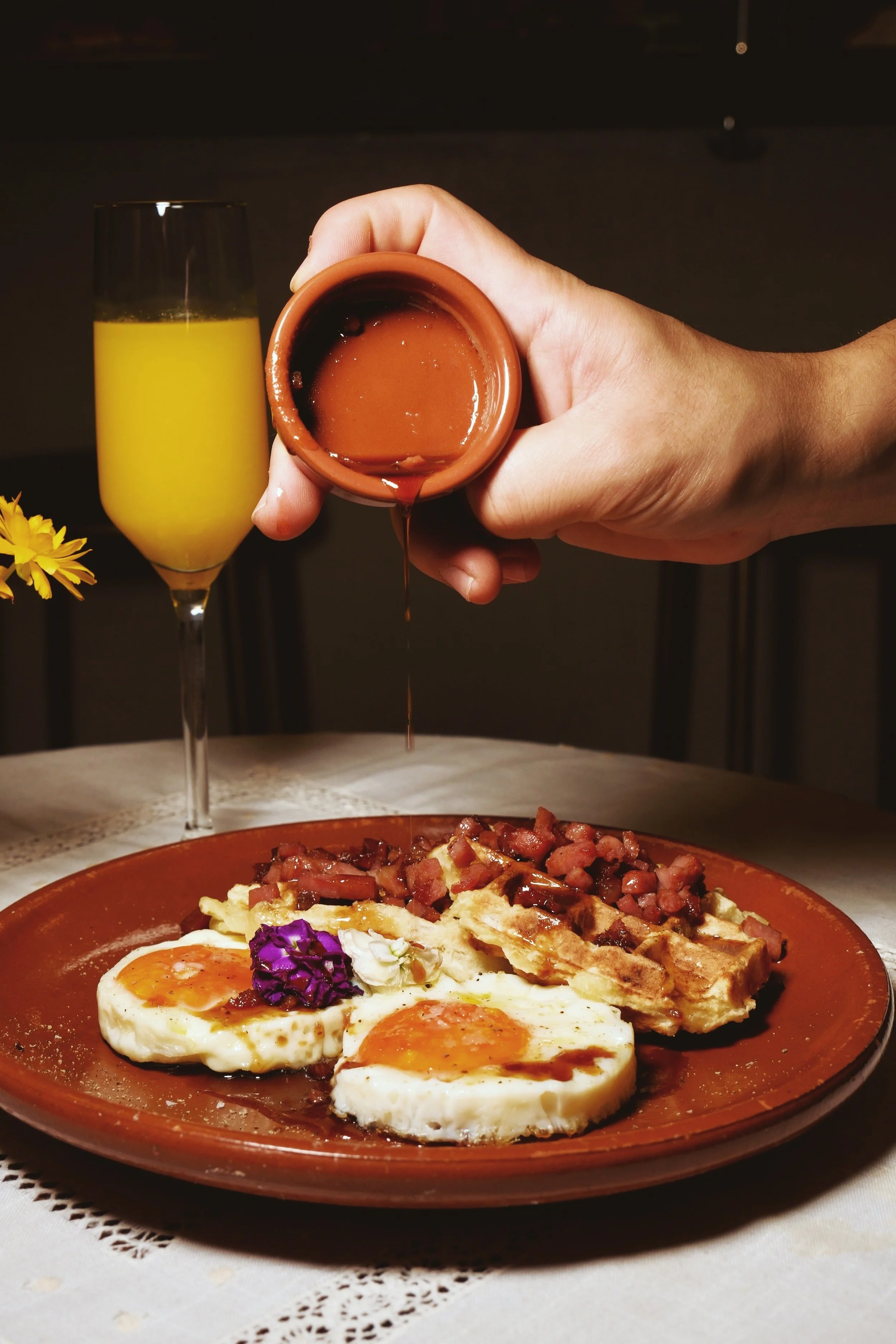 Plato de Waffle de yuca, huevos fritos, bacon en sirope de papelon, acompañado de un vaso de jugo de naranja y una mano vertiendo salsa en el plato.