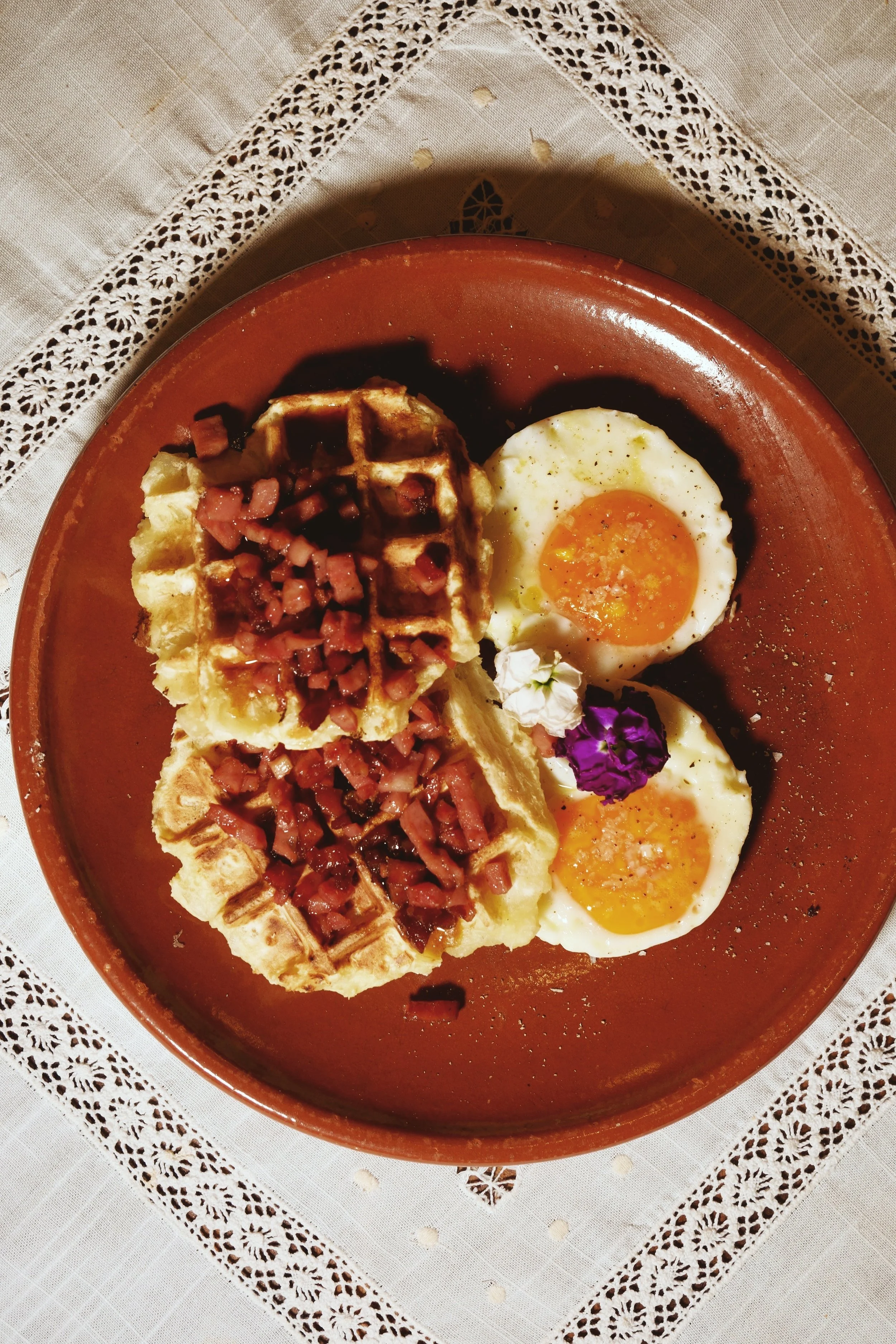 Plato de waffle de yuca, huevos fritos, bacon en sirope de papelon, decorado con una flor morada.