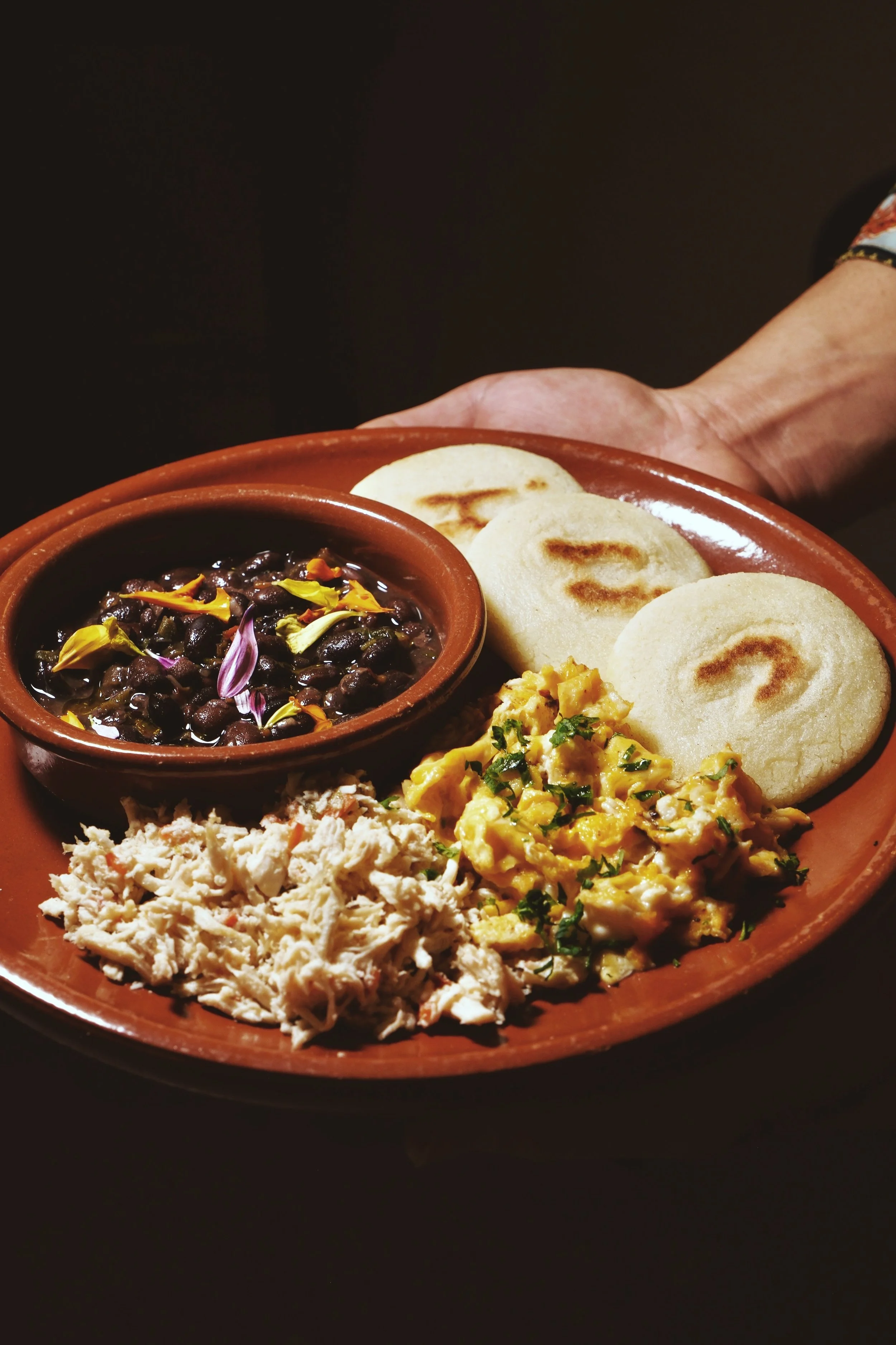 Plato de arepas con frijoles negros, pollo mechado y huevos revueltos.
