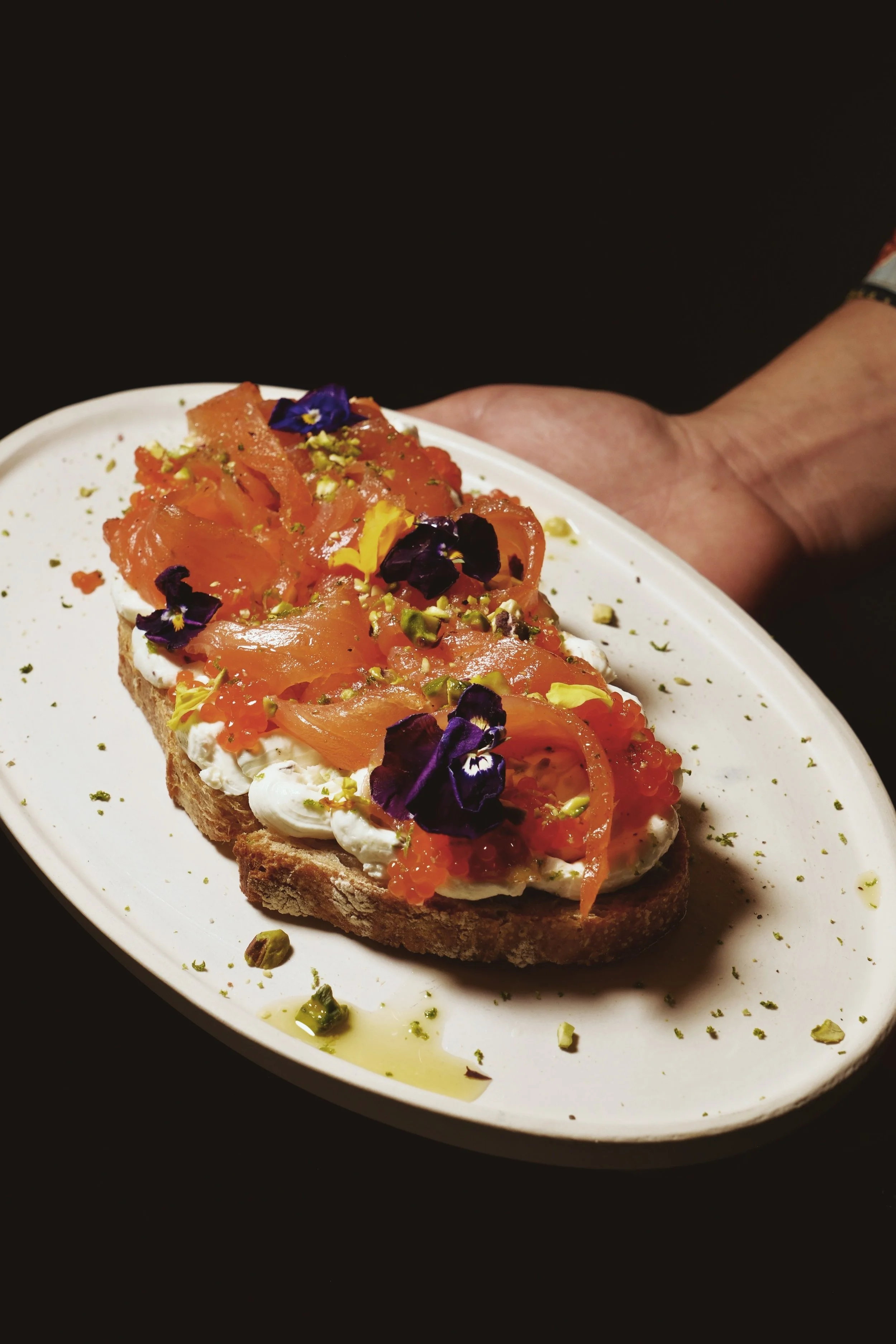Tostada de ricotta infusionada con pistachos, miel de azahar, salmón marinado.