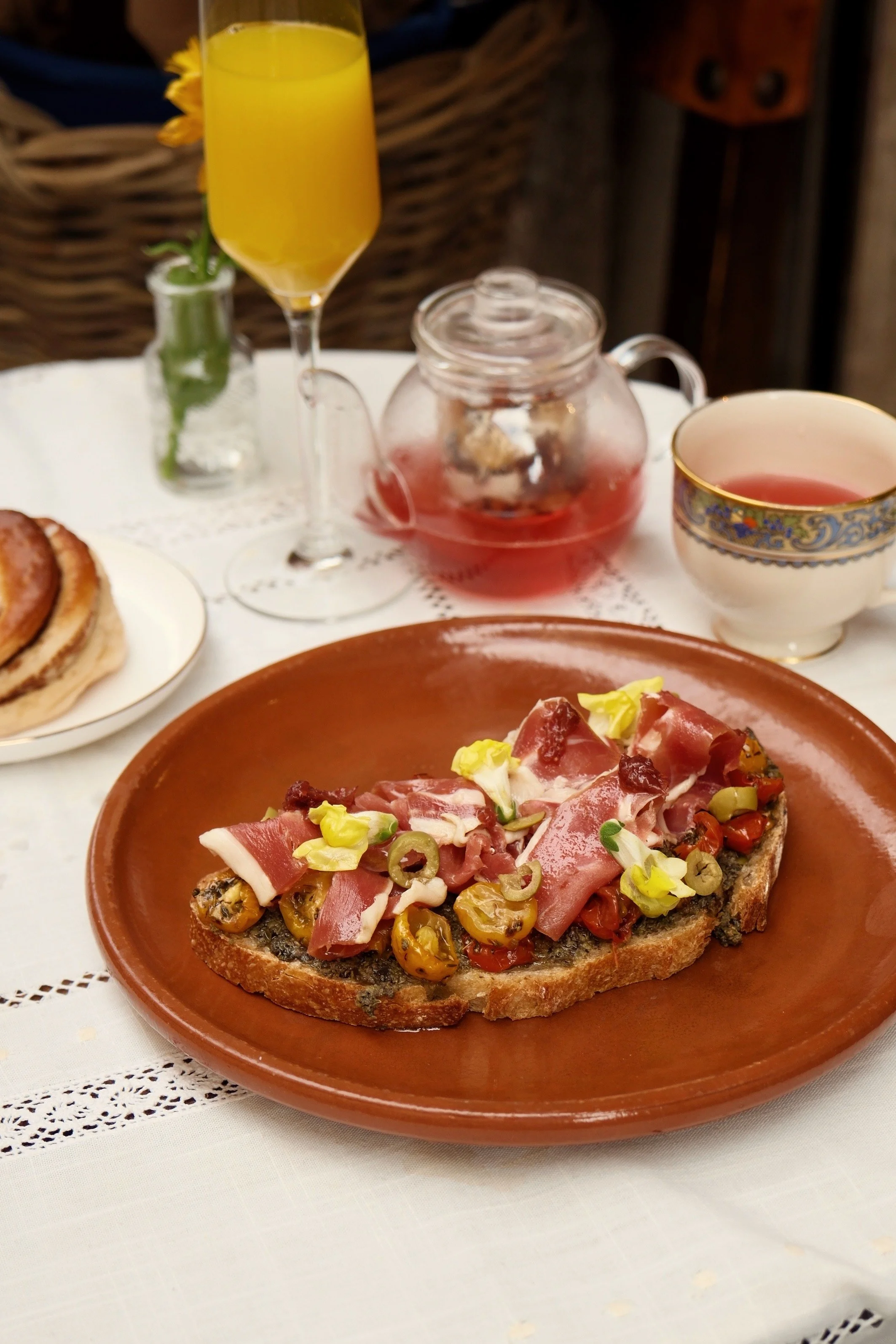Vista de un plato con una tostada de pan rústico con tomate confitado, jamón ibérico, tapenade, mermelada de higos y germinados, acompañado de una taza de té, un vaso de jugo de naranja y una tetera con infusión rosada en una mesa decorada.